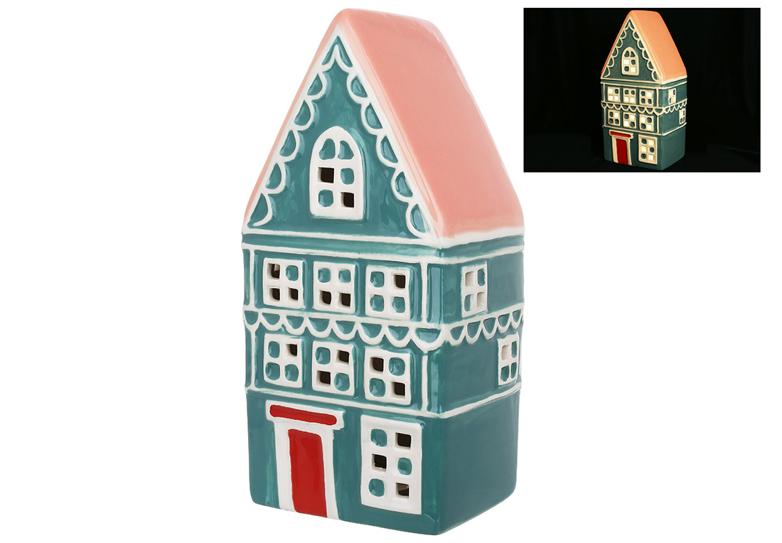 Керамічний будиночок з LED підсвічуванням, 9*7.3*19.5см, колір - бірюза з рожевим