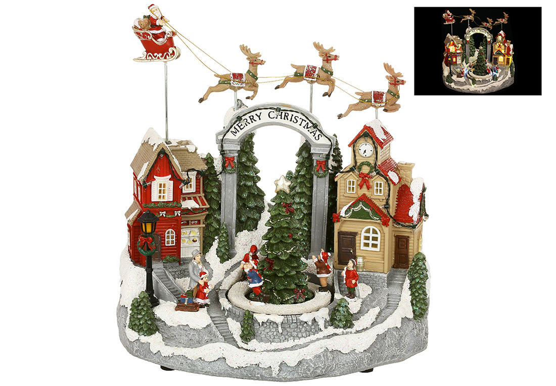 Музична фігура Різдвяне мiсто з LED підсвічуванням 31см (Санта з оленями з функцією руху вгору-вниз) (пісня Jingle Bells)