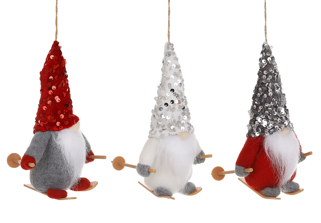 М'яка іграшка на підвісі Гномик на лижах у паєтках 18см, 3 дизайни, колір - червоний, білий, сірий