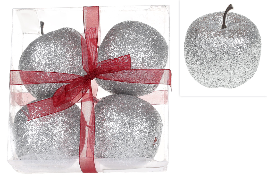 Набір (4шт) декоративних яблук на підвісі 6.5см, колір - срібний гліттер
