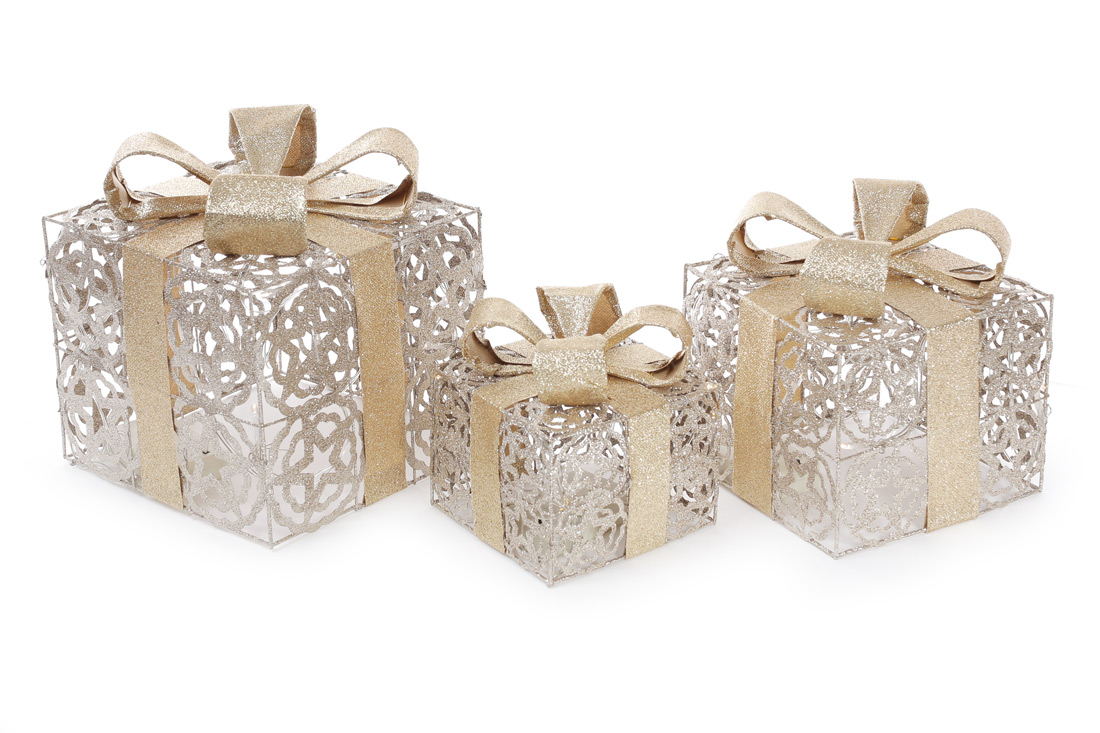 Набір декоративних подарунків (3шт) з підсвічуванням, 12.5см, 16.5см, 20см, колір - шампань із золотом