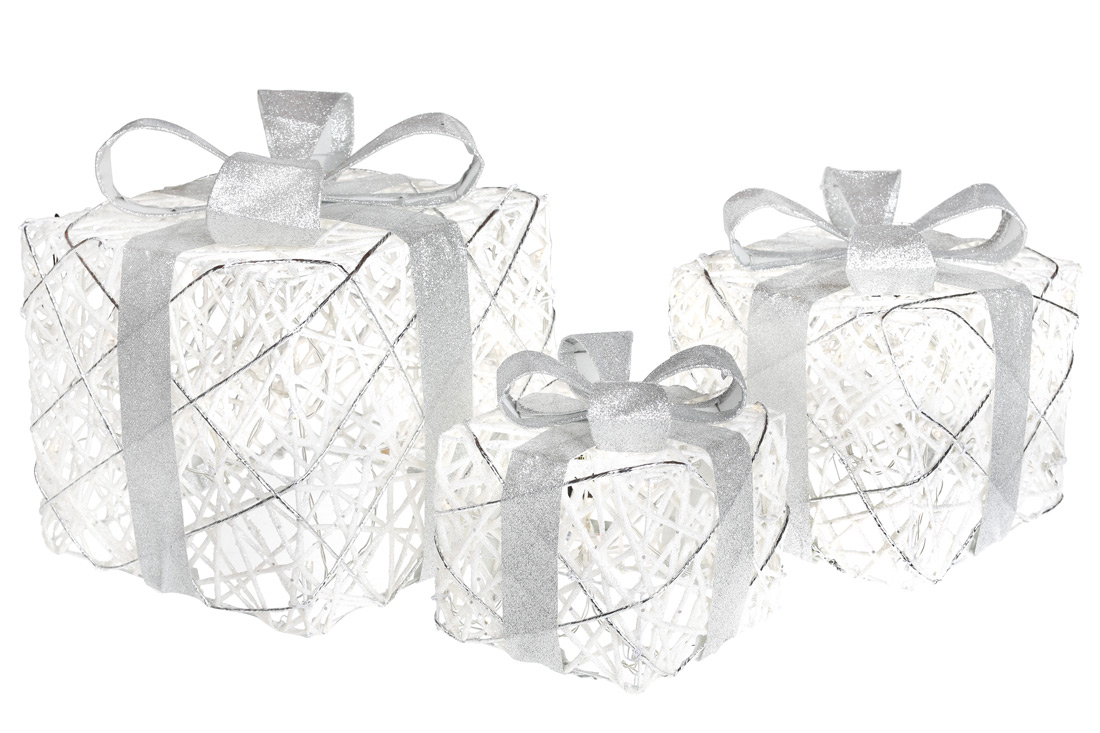 Набір декоративних подарунків (3шт) з підсвічуванням, 15см, 20см, 25см, колір - білий зі сріблом