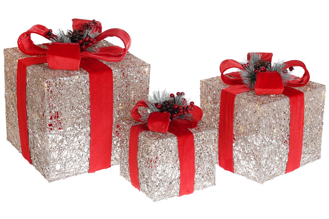 Набір декоративних подарунків (3шт) з підсвічуванням, 15см, 20см, 25см, колір - шампань із червоним оксамитовим бантом