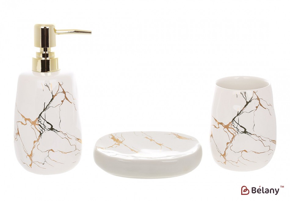 Набор для ванной (3 предмета): дозатор, стакан, мыльница, дизайн – белый мрамор с золотом