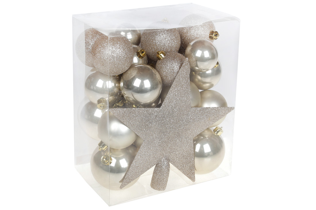 Набір ялинкових куль (29шт) з верхівкою на ялинку Зірка (20см), колір - шампань, мікс розмірів: 5см - 7шт, 6см - 18шт, 8см - 4шт