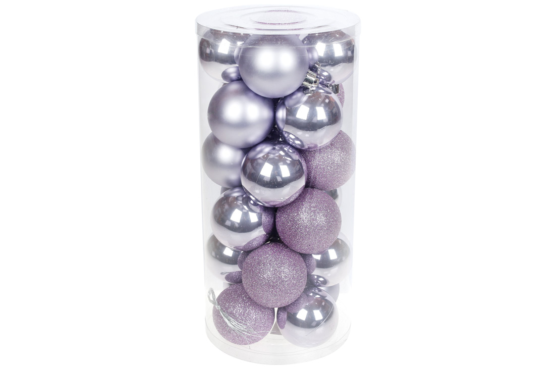 Набір ялинкових куль, 6см, 24шт; колір - ніжно-ліловий, 12шт - перламутр, по 6шт - гліттер, матовий