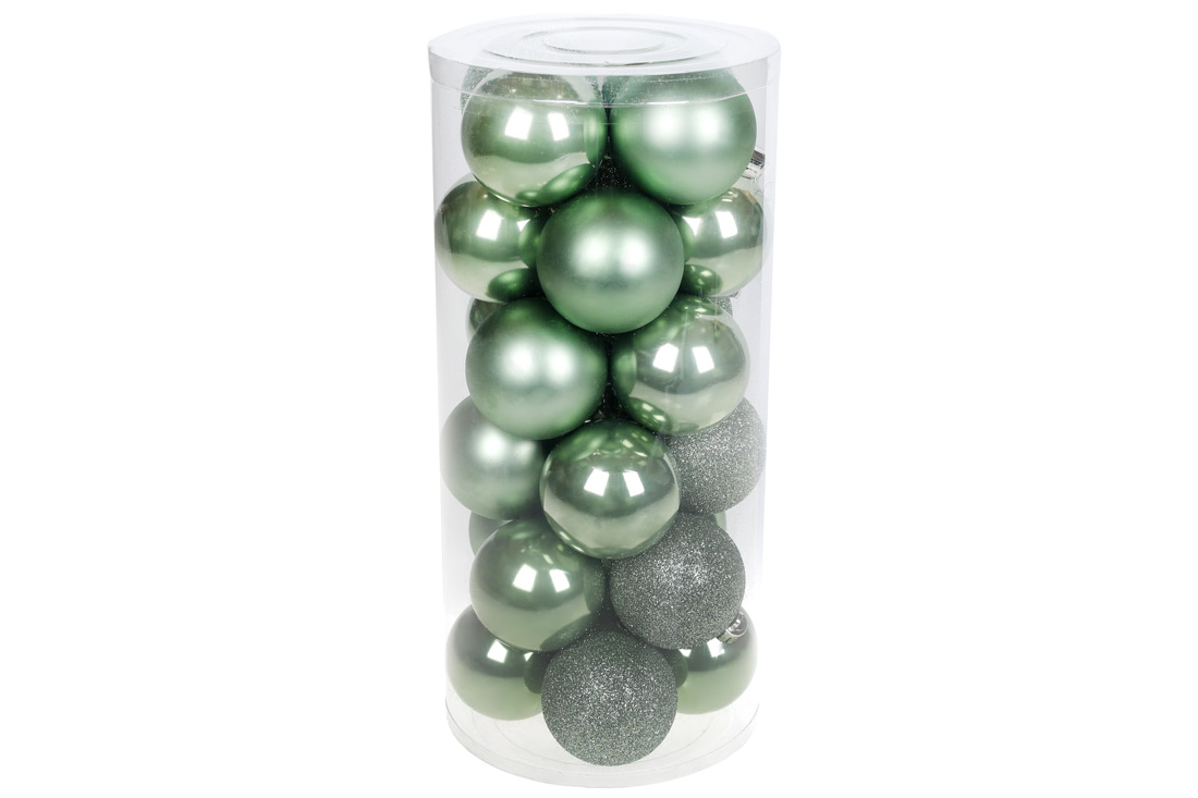 Набір ялинкових куль 6см, 24шт; колір - зелена шавлія, 12шт - перламутр, по 6шт - гліттер, матовий
