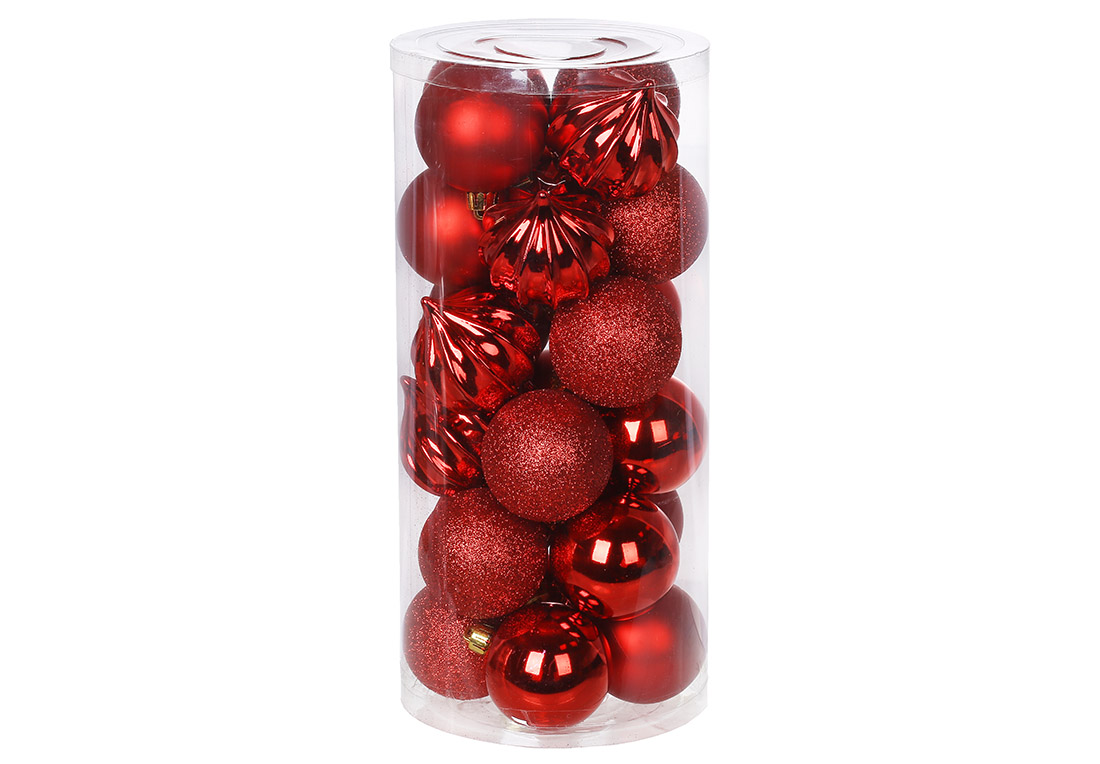 Набір ялинкових куль 6см, колір - червоний, 24шт: 6шт - рельєф глянець, 6шт - глянець, 6шт-матовий, 6шт-гліттер