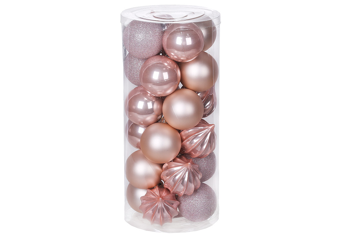 Набір ялинкових куль 6см, колір - рожевий, 24шт: 6шт - рельєф перламутр, 6шт - перламутр, 6шт - матовий, 6шт - гліттер