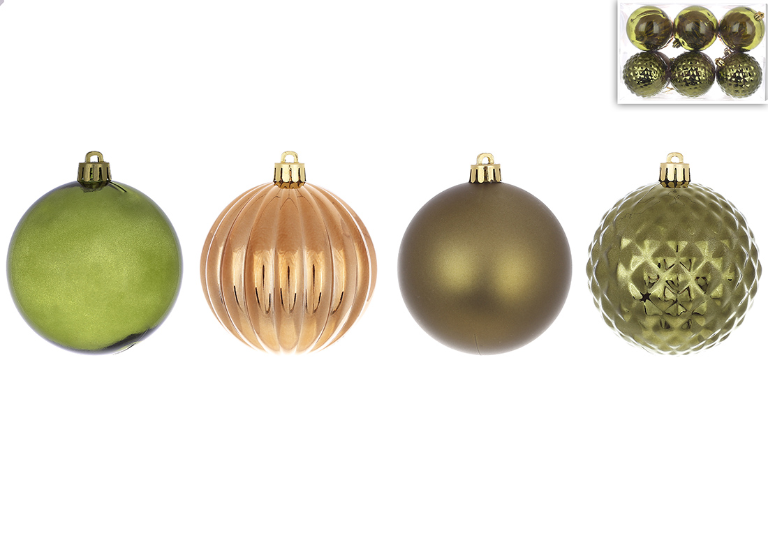 Набір ялинкових куль 8см, колір - хакі та мокко, 12шт: 6шт - рельєф глянець, 3шт - матовий, 3шт - прозорий