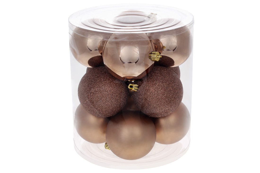 Набір ялинкових куль 8см, колір - карамельний мокко, 12шт: матовий, глянець і гліттер по 4шт
