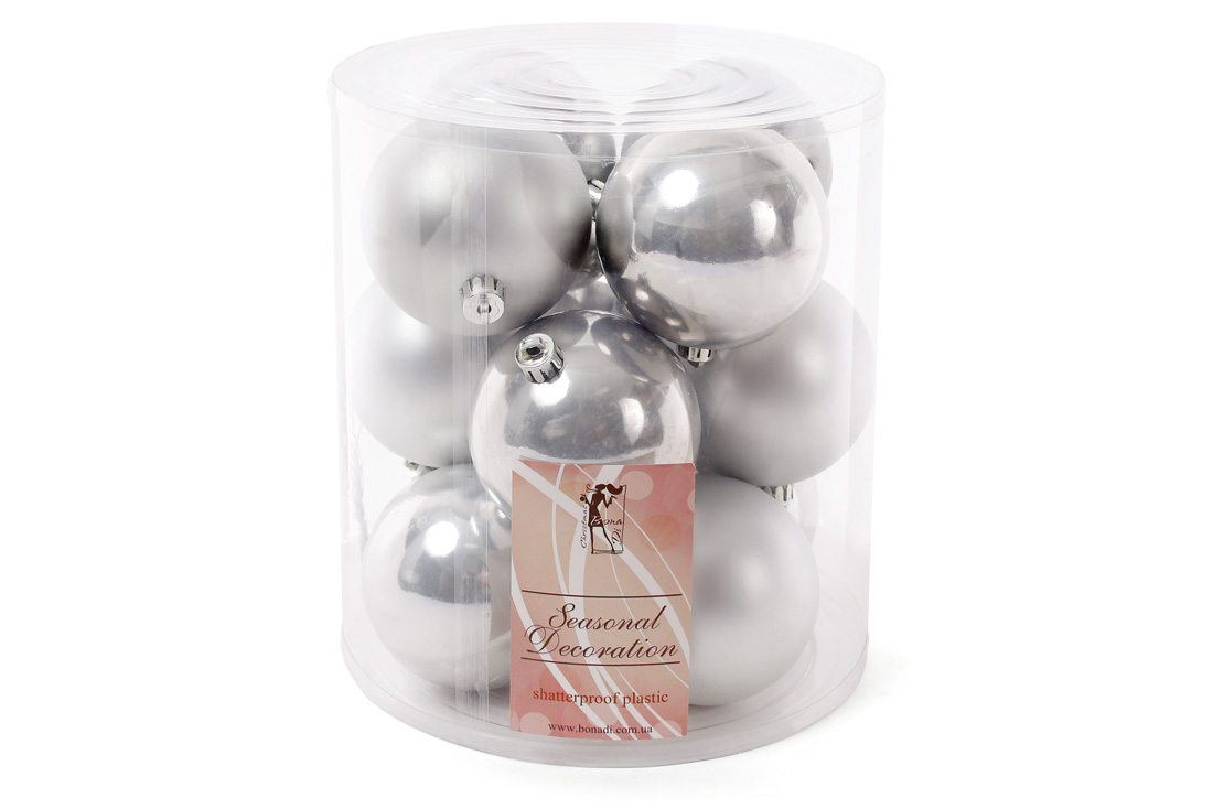 Набір ялинкових куль 8см, колір - срібло, 12шт: 6шт - матовий, 6шт - перламутр