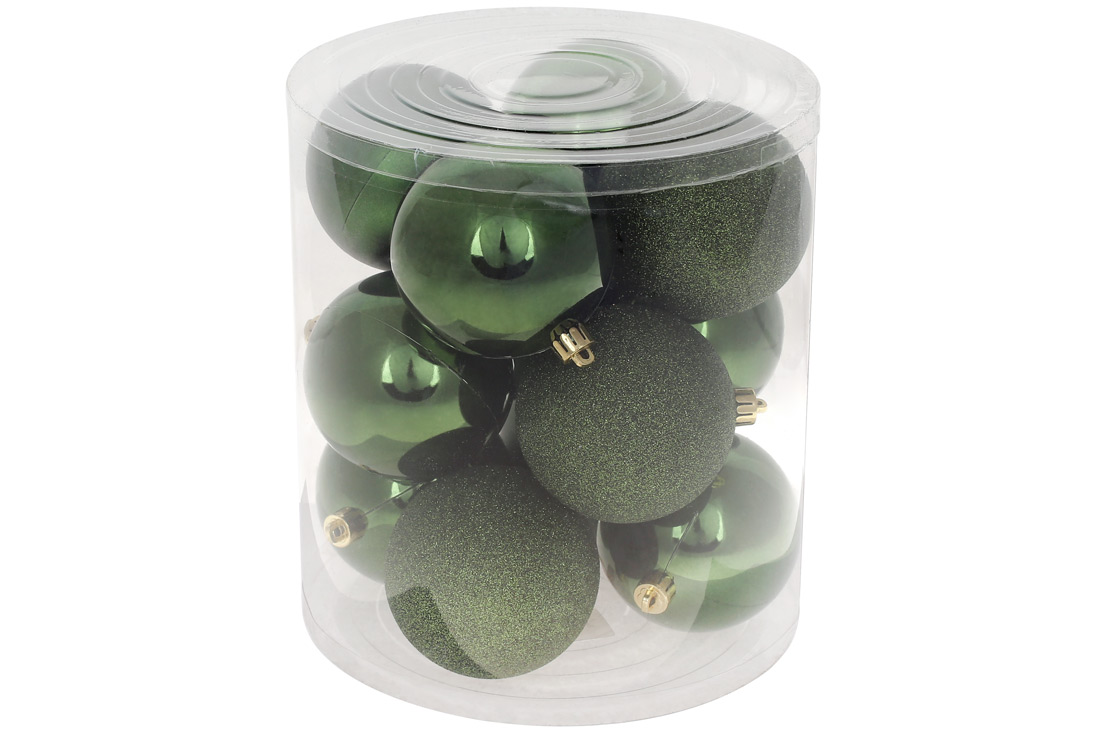 Набір ялинкових куль 8см, колір - зеленої хвої 12шт, 6шт - глянець, гліттер і матовий - по 3шт
