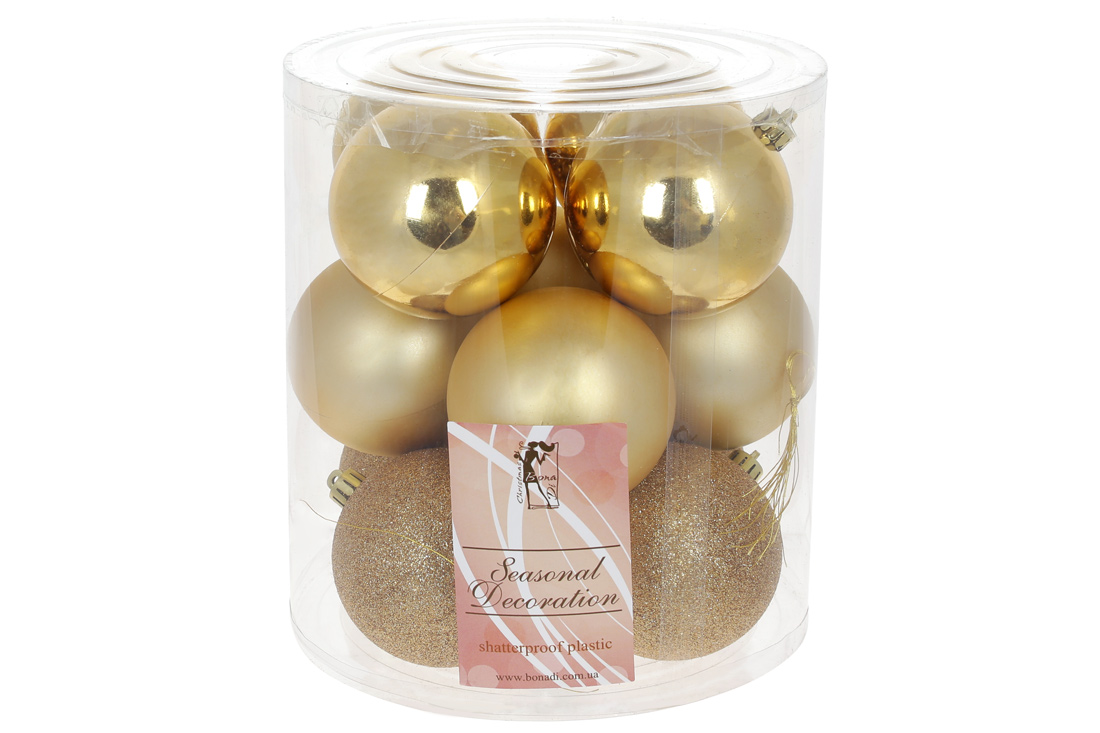 Набір ялинкових куль 8см, колір - золото, 12шт: матовий, глянець і гліттер по 4шт