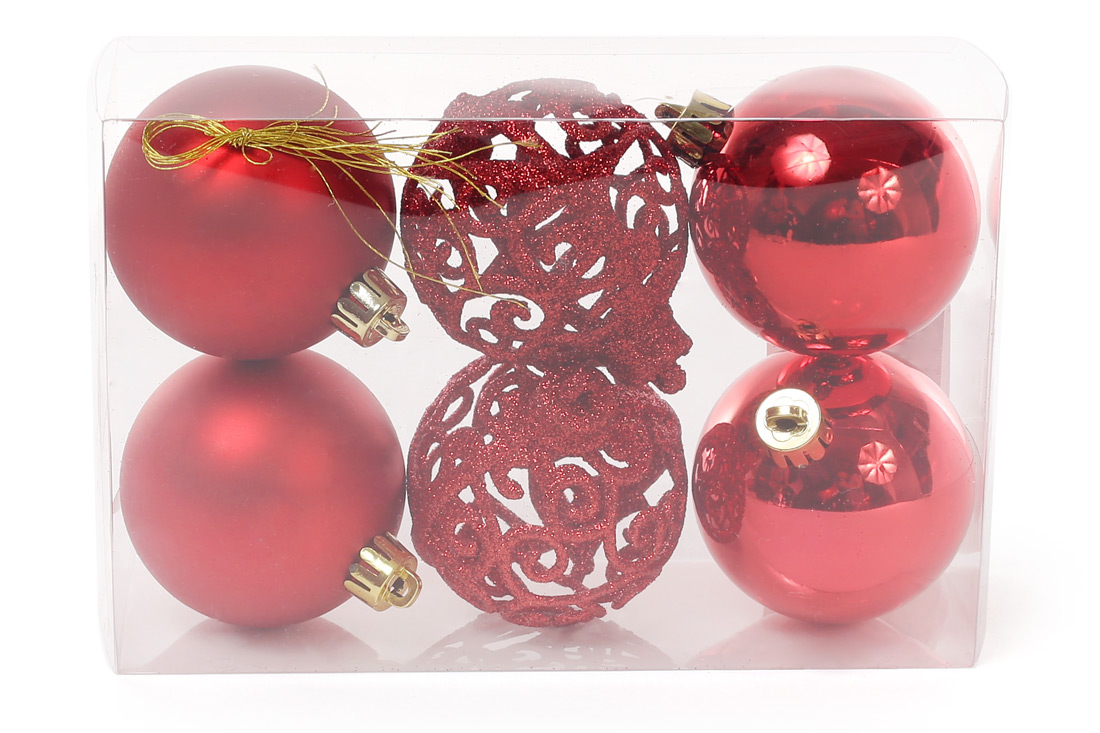 Набір ялинкових куль Ажур, 6 см, колір - червоний, 6шт: 2шт - матовий, 2шт - глянець, 2шт - ажур гліттер