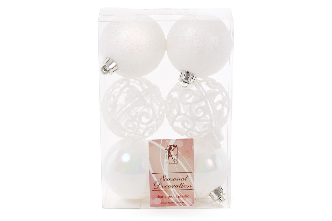Набір ялинкових куль Ажур, 6см, колір - білий, 6шт: 2шт - гліттер, 2шт - перламутр, 2шт - ажур гліттер