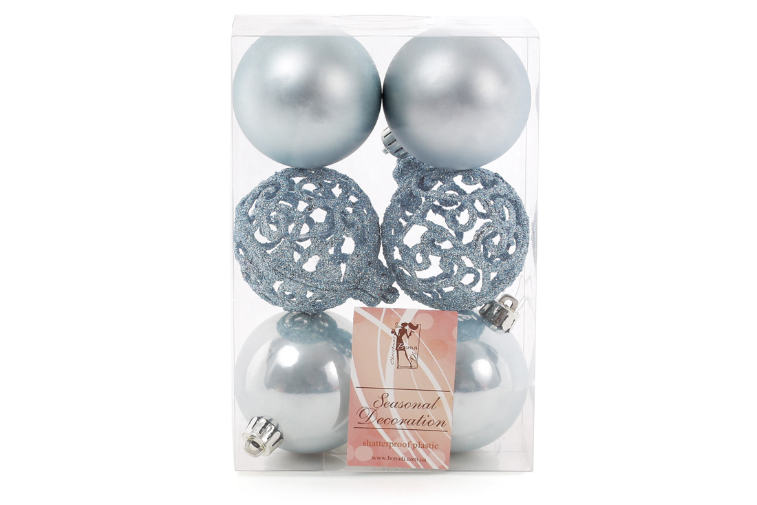 Набір ялинкових куль Ажур, 6см, колір блакитний, 6шт: 2шт - глітер, 2шт - перламутр, 2шт - ажур глітер