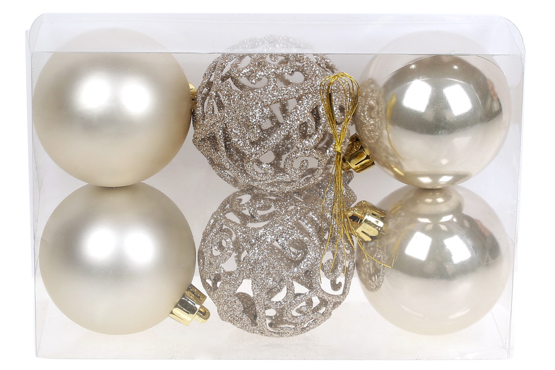 Набір ялинкових куль Ажур, 6см, колір - шампань, 6шт: 2шт - матовий, 2шт - перламутр, 2шт - ажур гліттер