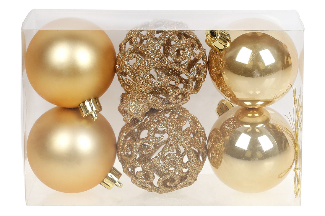 Набір ялинкових куль Ажур, 6см, колір - золото, 6шт: 2шт - матовий, 2шт - перламутр, 2шт - ажур гліттер