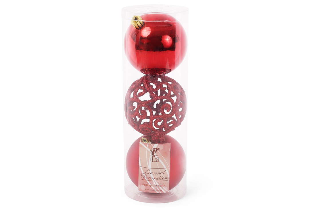 Набір ялинкових куль Ажур 8см, колір - червоний, 3 шт: матовий, ажур з гліттером, глянець