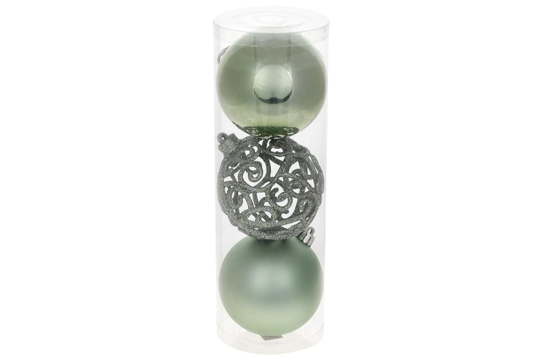 Набір ялинкових куль Ажур 8см, колір - зелена шавлія, 3шт: перламутр, ажур з гліттером, матовий
