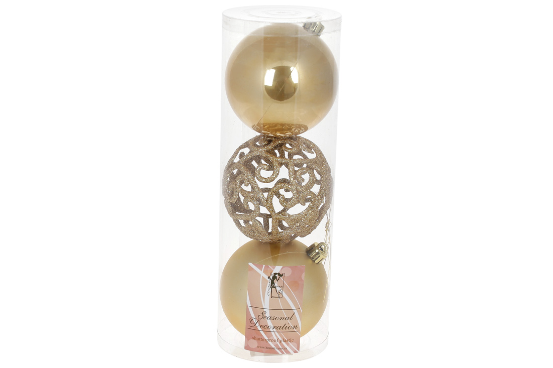 Набір ялинкових куль Ажур 8см, колір - золото, 3шт: перламутр, ажур з глітером, матовий