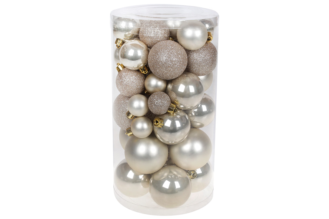 Набір ялинкових куль, колір - шампань, 40шт - 6см, 5см, 4см, 3см: 4шт - перламутр, 3шт - матовий, 3шт - гліттер для кожного розміру