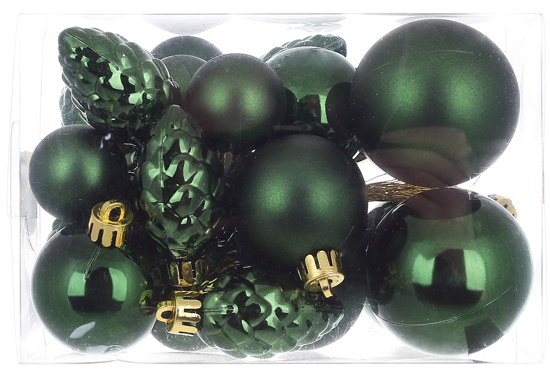 Набір ялинкових куль і шишок 25шт, колір - темно-зелений, Шишки: 4.5см - 10шт глянець, Кулі: 3см -5шт матові; 4см - матовий і глянець по 3шт; 5см - ма
