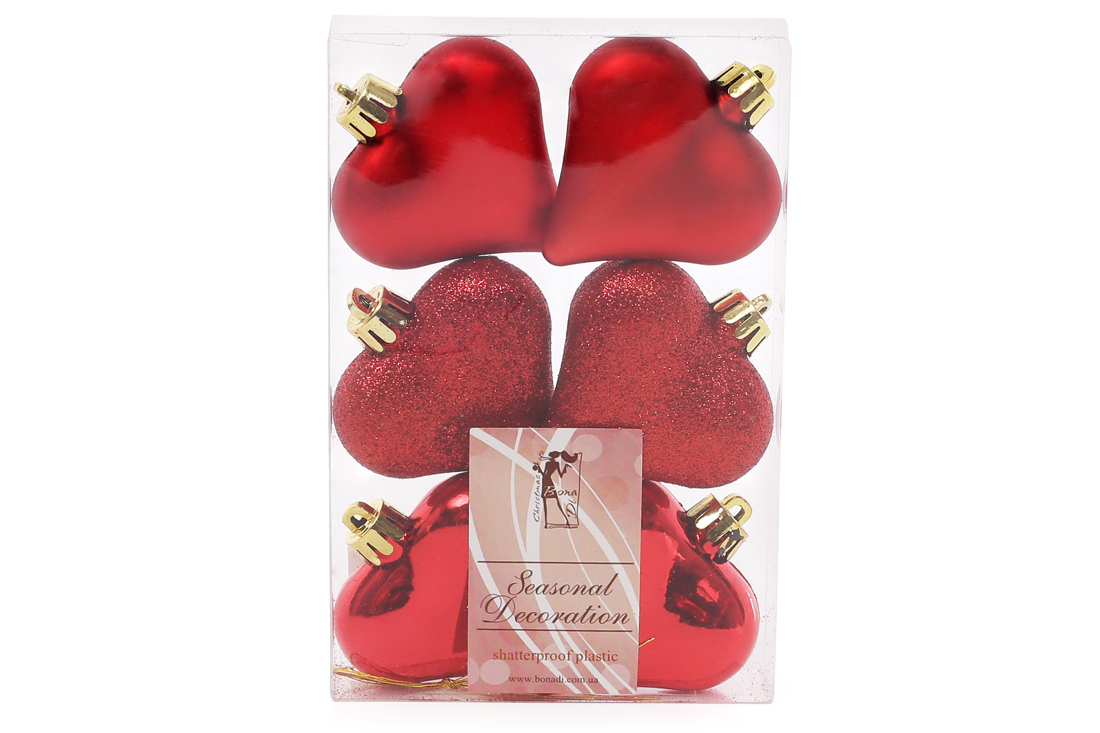 Набір ялинкових прикрас Серця 6см, колір - червоний, 6шт: глянець, матовий, гліттер - по 2шт