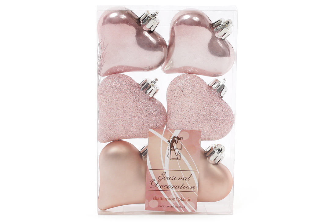 Набір ялинкових прикрас Серця 6см, колір - рожевий, 6шт: перламутр, матовий, гліттер - по 2шт