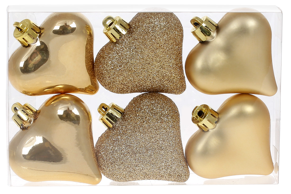 Набір ялинкових прикрас Серця 6см, колір - золото, 6 шт.: перламутр, матовий, гліттер - по 2 шт