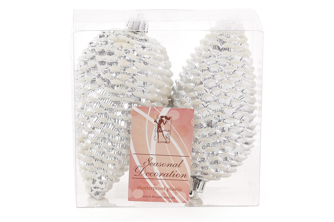 Набір ялинкових прикрас Шишки 12см, колір - срібло, 2 шт: глянець із гліттером