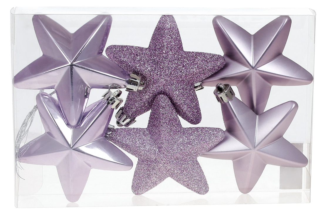 Набір ялинкових прикрас Зірки 7.5см, колір - ніжно-ліловий, 6шт; перламутр, матовий, гліттер - по 2шт