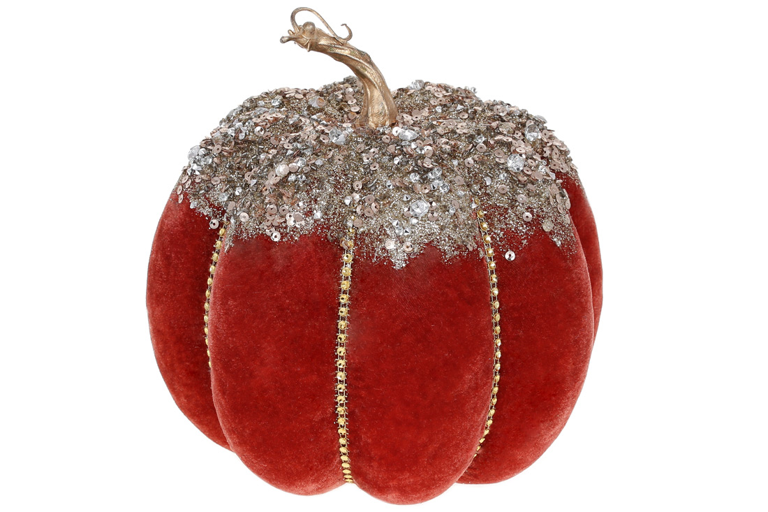 Новорічний декор Гарбуз з оксамитовим покриттям та декором зі страз, 21см, колір - темно-жовтогарячий