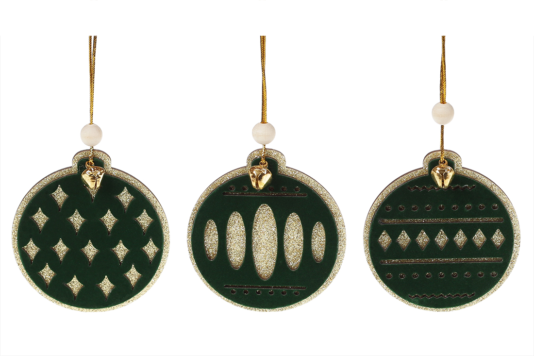 Новорічний підвісний декор з темно-зеленим оксамитом, 8,5 см, 3 дизайни