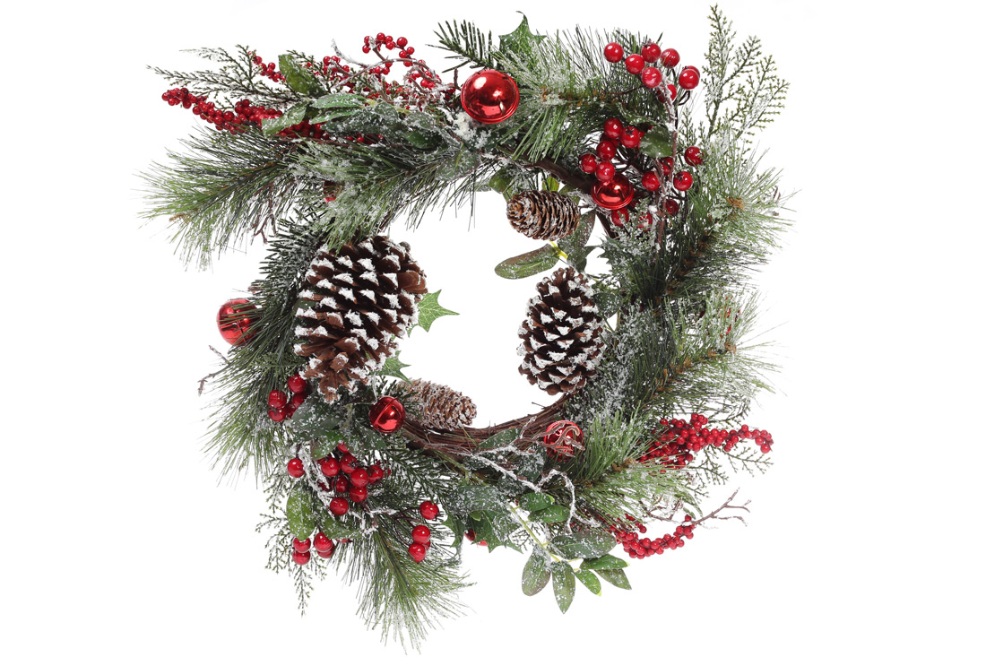 Новорічний вінок з декором з ягід, шишік і бубонців, 50см