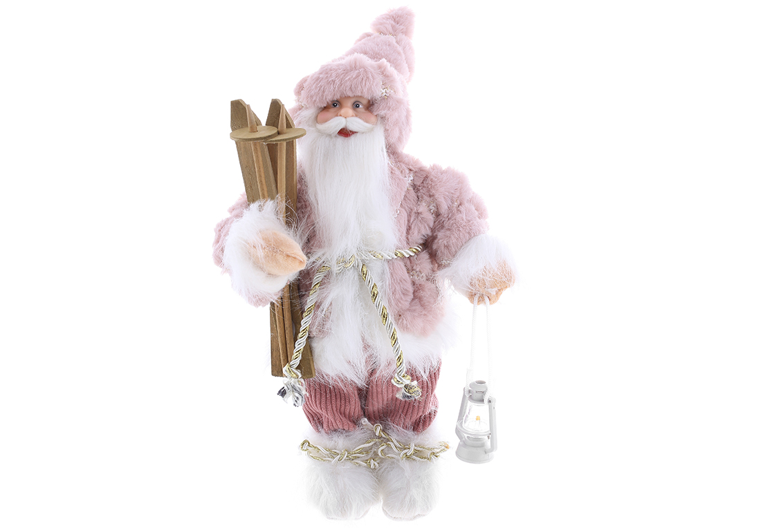 Новорічна фігура Санта з лижами та ліхтариком, 30см, колір - рожевий з білим.