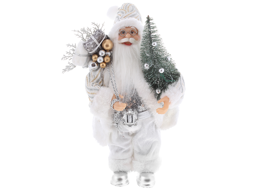 Новорічна фігура Санта з подарунками та ялинкою, 30см, колір - білий зі сріблом