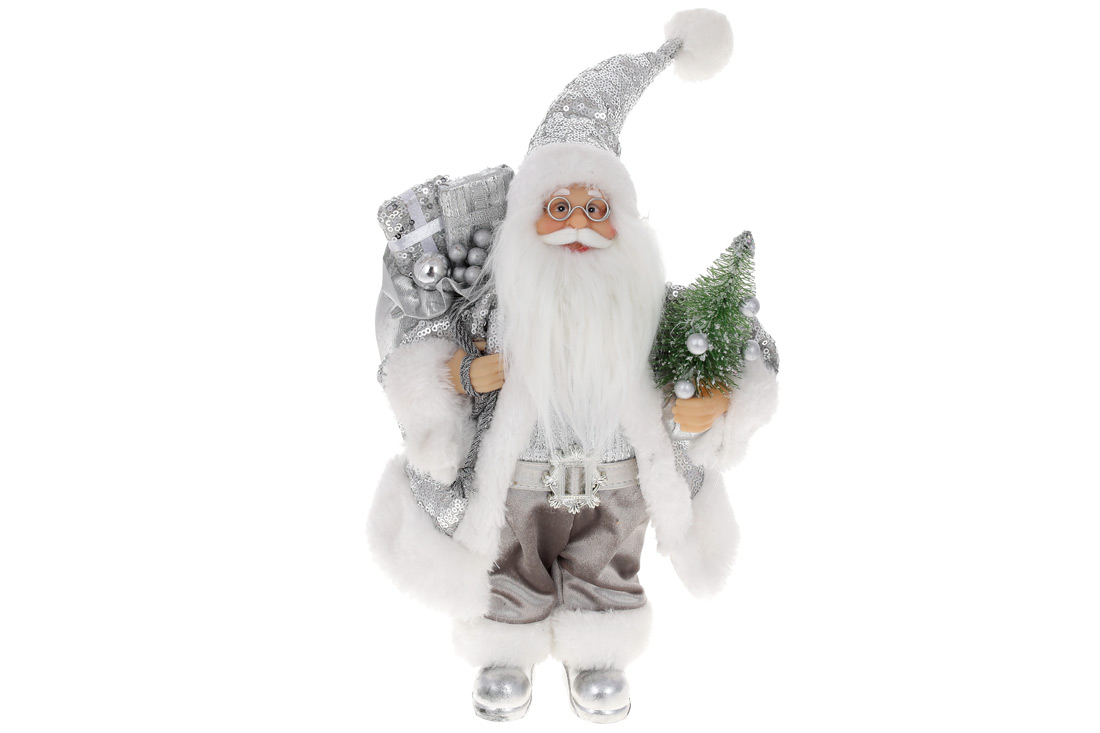 Новорічна фігура Санта з подарунками та ялинкою, 30см, колір - сріблястий з паєтками