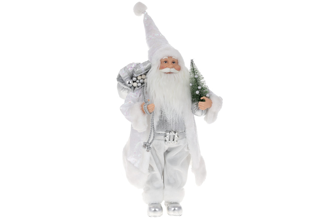 Новорічна фігура Санта з подарунками та ялинкою, 45см, колір - білий зі сріблом з паєтками