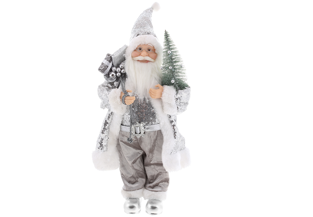 Новорічна фігура Санта з подарунками та ялинкою, 45см, колір - сріблястий з паєтками