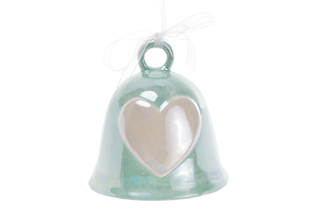 Підвісний декор дзвіночок з об'ємним декором Серце, 9см, колір - м'ятний перламутр (є крек емалі)