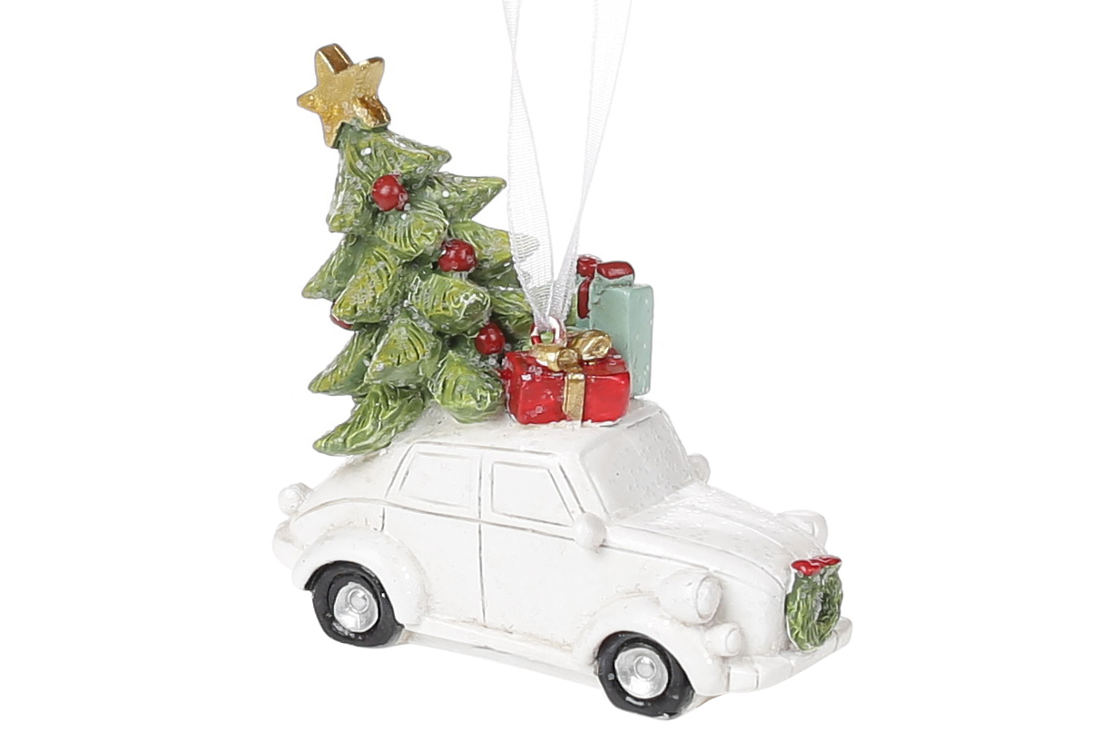 Підвісний декор Машинка з новорічною ялинкою, 6.5см, колір - білий