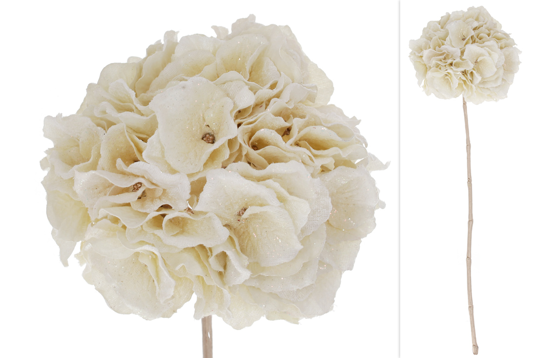 Преміальна оксамитова Гортензія з гліттером на нозі 62 см, колір - кремова шампань