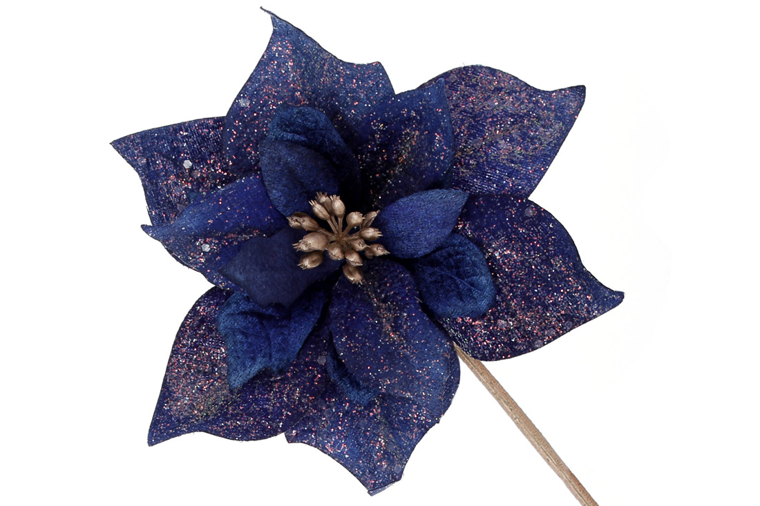 Преміальна квітка Пуасеттія з оксамиту з глітером на нозі 32см, колір - королівський синій