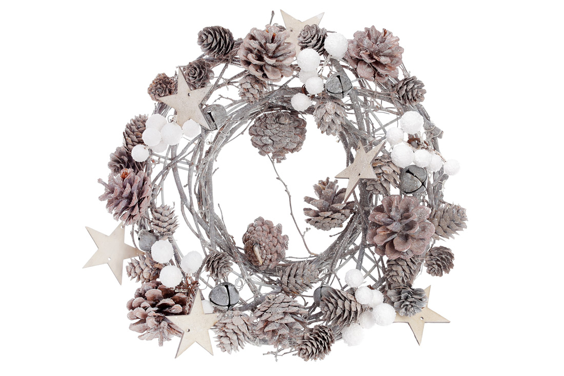 Вінок із натуральних шишок з декором, колір - натуральний із білим