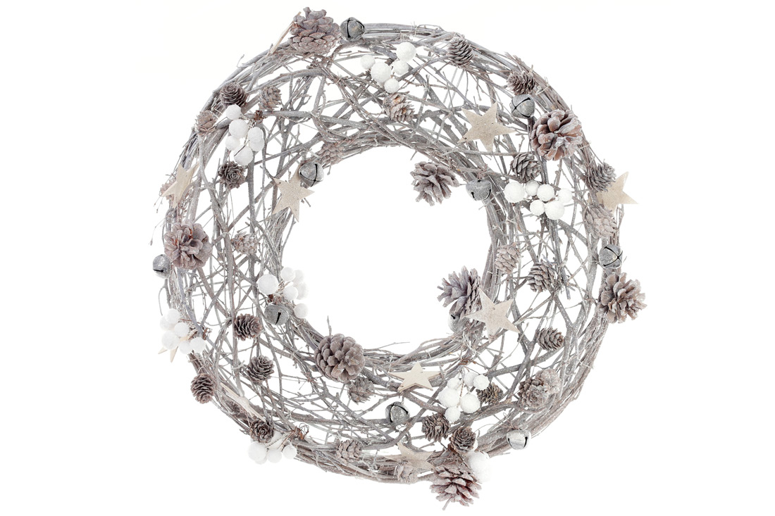 Вінок із натуральних шишок з декором, колір - натуральний із білим