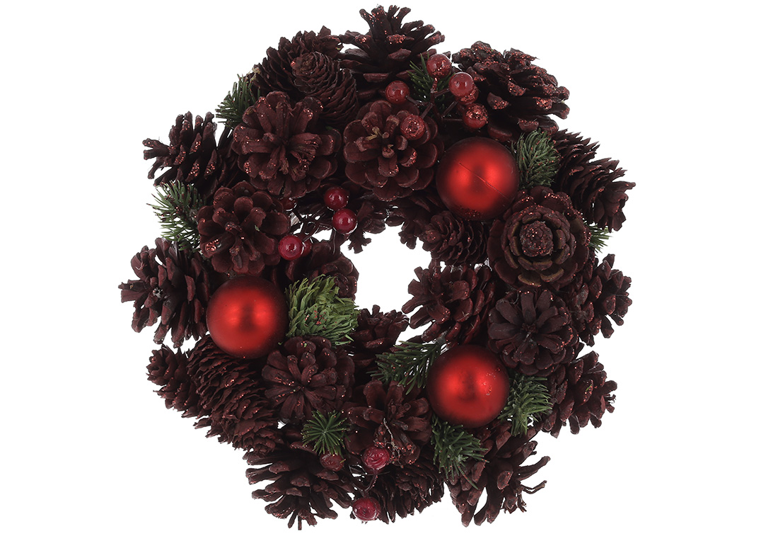 Вінок новорічний з декором з шишок та куль 26см, колір - бордо