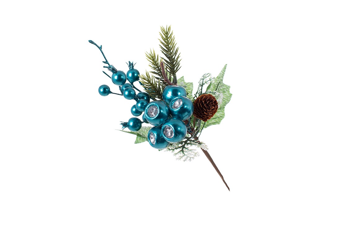 Гілка з хвої та перламутрових ягід з кристалом, колір: блакитний, 25см
