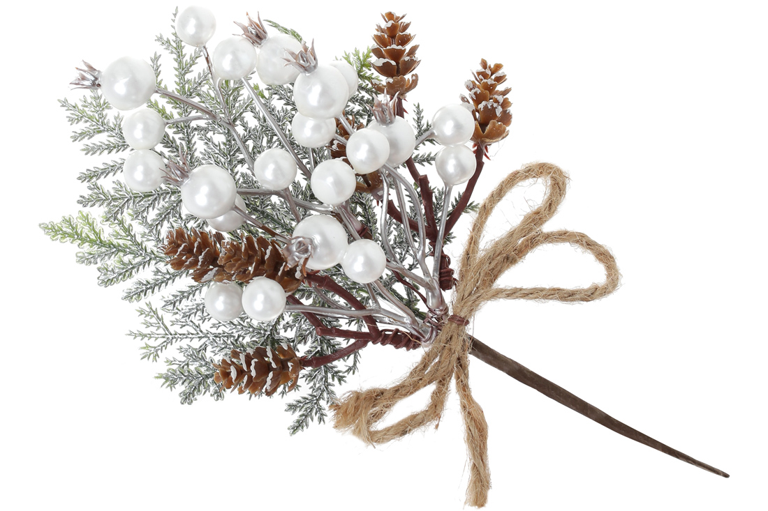Гілка з хвої з білими перламутровими ягодами та дрібними шишками, 22см